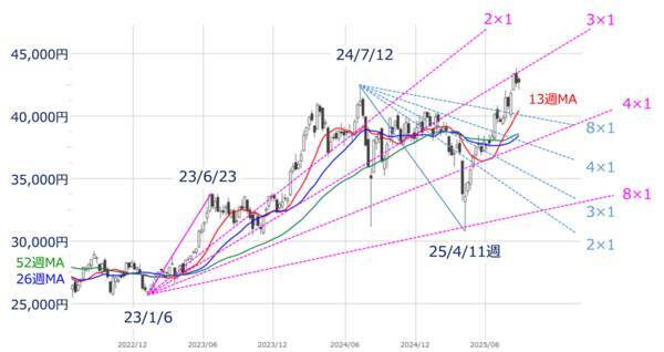 <図4>日経平均(週足)のギャン・アングル(2025年8月29日時点)
