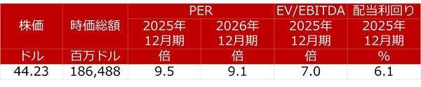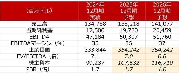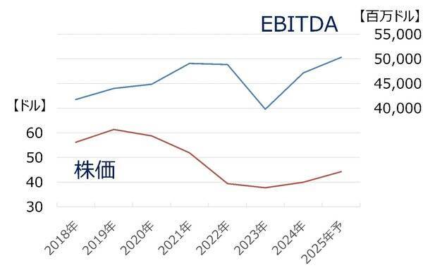 ベライゾン・コミュニケーションズのEBITDAは現在の事業セグメント構成になった2018年以降、400億ドル台の前半から後半へと全体としては水準を切り上げていく展開となっており、2025年度には500億ドルを突破して過去最高となる見通しとなっております。他方で株価は、携帯アカウント数の微減傾向にフォーカスして悲観視する見方があることもあり、軟調に推移しています。