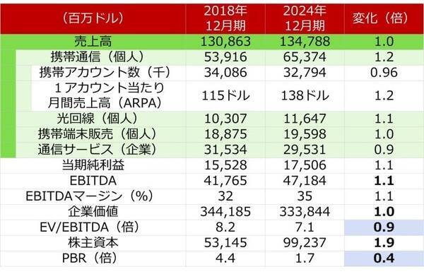 <ベライゾン・コミュニケーションズの業績(2018年12月期と2024年12月期実績の比較)>