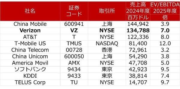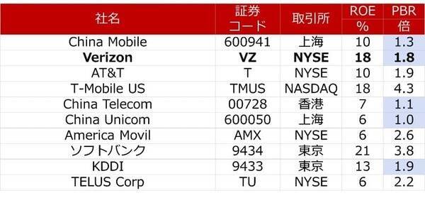 ベライゾン・コミュニケーションズの比較対象に適する携帯電話通信サービスの上場同業他社には米AT&T(T:NYSE)、米T-モバイル・US(TMUS:NASDAQ)に加えて、中国のチャイナ・モバイル(中国移動)(600941:上海)、メキシコの アメリカ・モービル(AMX:NYSE) 、 ソフトバンク(9434:東京) 、 KDDI(9433:東京) 、カナダの テラス(TU:NYSE) などがあります。