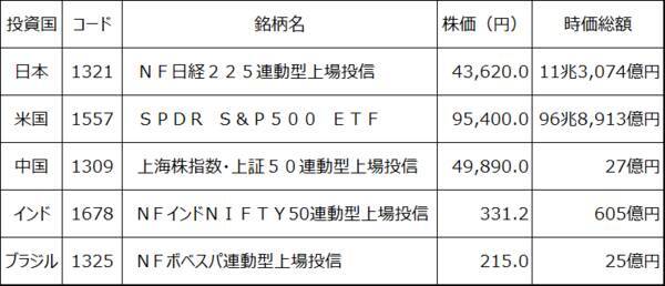 <東証上場ETF、日・米・中・印・ブラジルの株価指数に投資する代表銘柄:2025年9月2日時点>