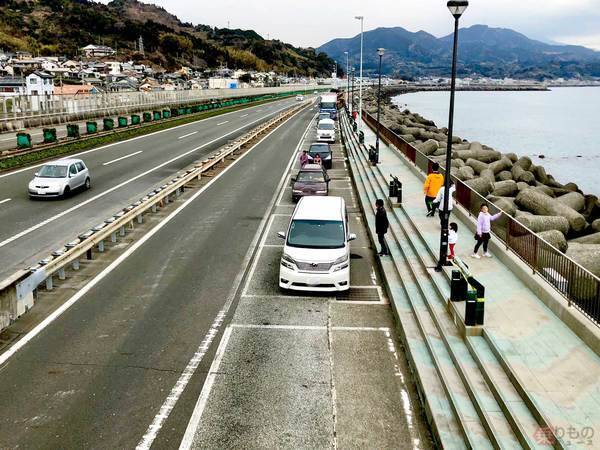 海に面した由比PA(2019年4月、乗りものニュース編集部撮影)。