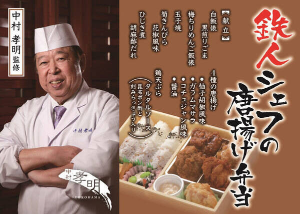 「鉄人シェフ」の中村孝明さんが監修。主役はゆず胡椒、ガラムマサラ、コチュジャン、醤油で味付けした4種類の鶏唐揚げと、昆布ポン酢と刻みらっきょうのタルタルソースを添えた鶏天です。たけのこきんぴらには花椒(ホアジャオ)油、ひじき煮にはごま酢だれが加えられ、俵ご飯は白飯と梅ちりめんの2種類を楽しめます。