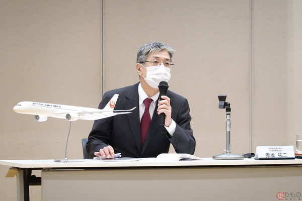 記者会見をしたJALの赤坂祐二社長(2020年10月7日、乗りものニュース編集部撮影)。