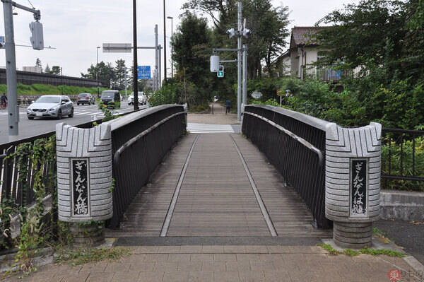 玉川上水に架けられた「ぎんなん橋」。廃線跡を示すレールが敷かれている(2020年10月、内田宗治撮影)。