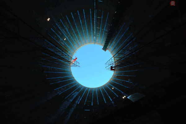 リニア中央新幹線「名城非常口」83mの底から仰いだ秋空(2020年11月12日、恵 知仁撮影)。