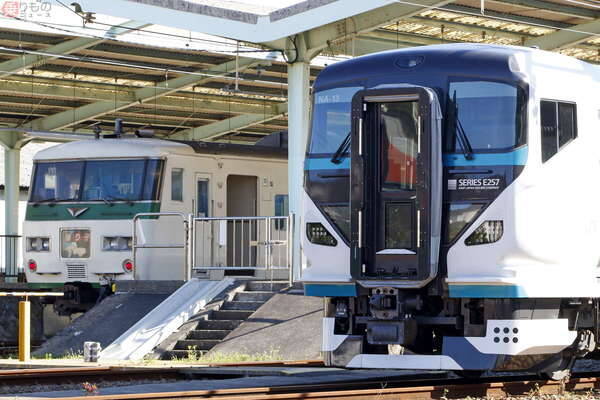 185系特急「踊り子」と並ぶE257系2000番台(2020年3月、伊藤真悟撮影)。