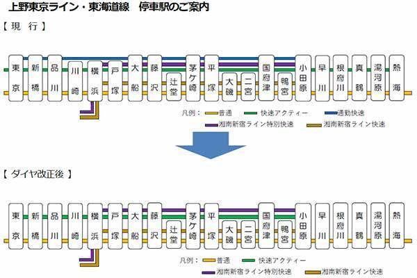 東海道線は川崎・横浜・戸塚を通過する通勤快速を廃止し、快速「アクティー」と統合。その快速「アクティー」も昼間の設定をなくし、ダイヤ改正後は下り夜間帯のみの運転に縮小します。一方で湘南新宿ラインの特別快速・快速は引き続き運行されます。停車駅はいずれも現行と同じです。