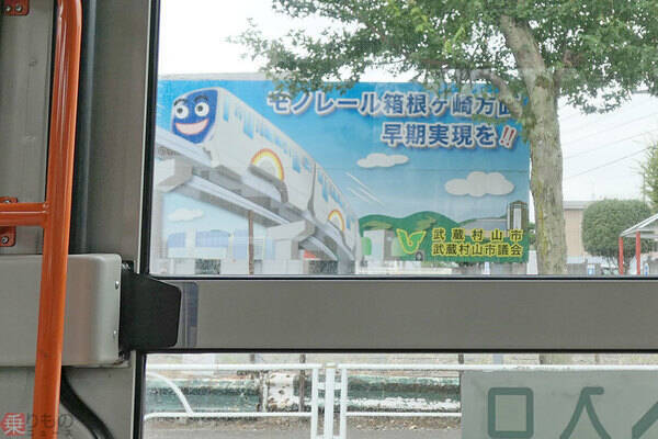 村山団地バス停付近に立つモノレール建設促進の看板(2020年9月、宮武和多哉撮影)。