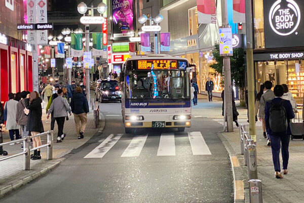 渋谷センター街を行く渋66系統の京王バス(乗りものニュース編集部撮影)。