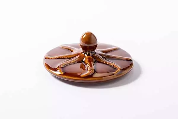 蓋は「ひっぱりだこ飯」のつぼと同じ陶器製です。タコの頭をつまんで持ち上げられるようデザインされています。過去に販売されてきた「ひっぱりだこ飯」シリーズのほぼ全てのつぼの口径に合うように工夫を凝らしたといいます。