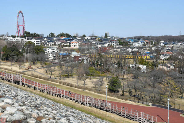 西武遊園地駅付近を走る西武多摩湖線の電車。多摩湖の堰堤から(2021年2月、内田宗治撮影)。