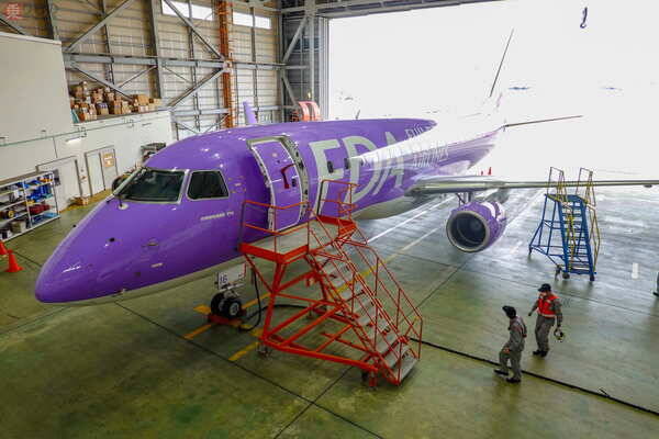今回のイベントは、2021年3月中に3度の開催が予定されており、取材したのは2回目のもの。映画のような荘厳なBGMをバックに、FDA機(機番:JA16FJ、エンブラエル175型機)が名古屋空港の格納庫に入ってくるところからツアーは始まります。