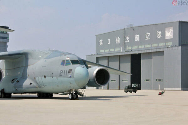 隠岐の島からの新型コロナウイルス患者搬送訓練に参加した、航空自衛隊第3輸送航空隊のC-2輸送機211号機(2021年3月15日、月刊PANZER編集部撮影)。