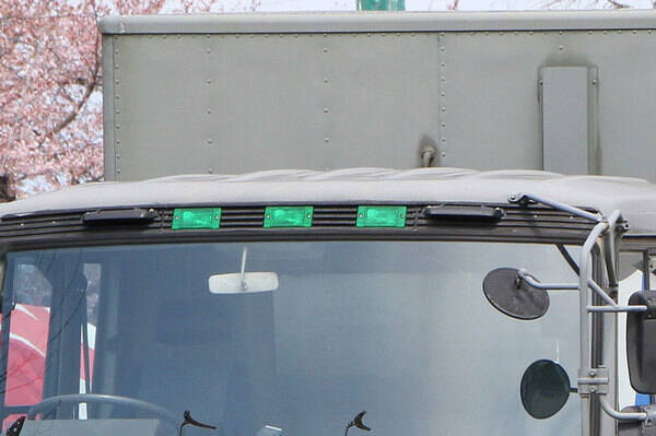 大型トラックは、暗い中でもその大きな車体の存在を周囲に知らせるために、側面にいくつかのマーカーランプを備えていますが、かつては車両のおでこ、キャビン(運転席)の上部にも、3つ並んで緑色に光るランプが見られました。
