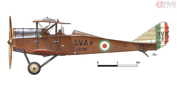 第1次大戦後半にイタリアが開発した国産飛行機S.V.A.シリーズ。高速性に優れていたため、偵察機や爆撃機、練習機など幅広く使われ、1920年には日本にも来ています。