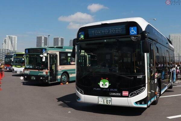 「ライオンキング」夜公演日に運行都営バスの燃料電池バス(草町義和撮影)。