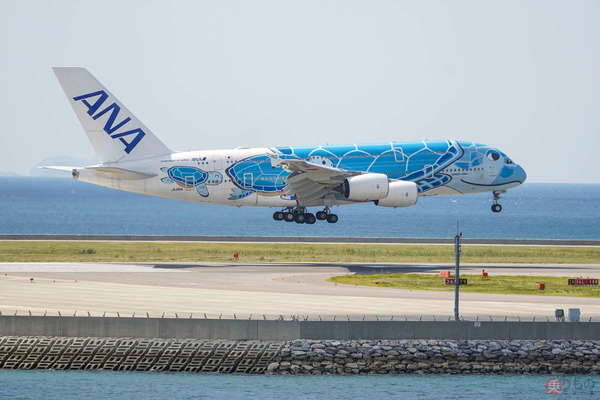 このとき出発待機を余儀なくされた飛行機のなかには、偶然にも“カメ”をモチーフにしたものが存在しました。ANA(全日空)が運用している総2階建ての超大型旅客機、エアバスA380「フライングホヌ(空飛ぶウミガメ)」の初号機(機番:JA381A)です。