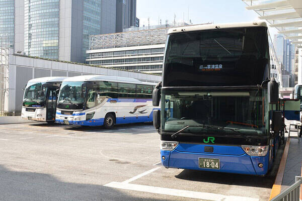 平日朝9時台のバスタ新宿。中距離路線の便が多く発着する(中島洋平撮影)。