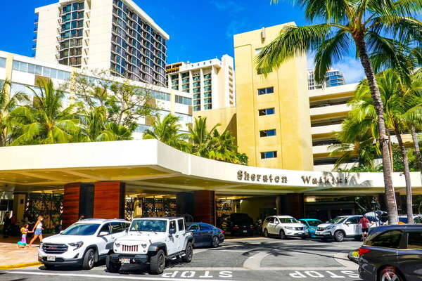「シェラトン・ワイキキ」の玄関部分(2021年8月、乗りものニュース編集部撮影)。