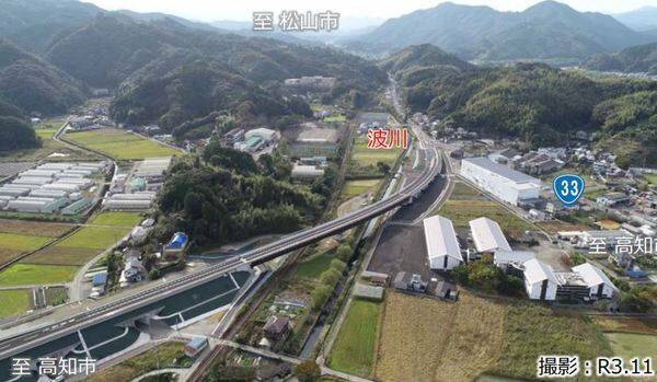 JR波川駅付近で国道33号現道に直結全通を来月に控えた高知西バイパス(画像:国土交通省)。