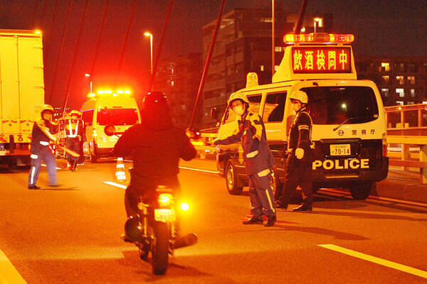都内102か所以上で実施された飲酒検問のうち、警視庁城東署は3日22時~24時まで、江戸川区清新町と江東区新砂を結ぶ清砂大橋の橋上で、警察官約20人を動員しました。