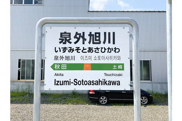 2021年3月、秋田~土崎間に開業したばかりの新駅です。つい「旭川」の2文字が目に入ってしまいますが、実は「泉+外旭川」が正解。「泉(いずみ)地区」と「外旭川(そとあさひかわ)地区」の中間地点に位置するため、両者の地名を合成して駅名としたのです。貨物駅を含む広大な鉄道敷地で隔てられた背景から、バス停も「外旭川駅前」など、個々の地区に即したものになっています。