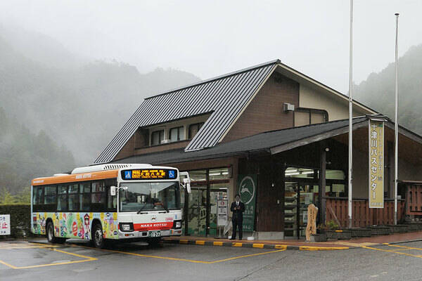 またここには、奈良交通の十津川営業所が併設されており、ここから迫西川(せいにしがわ)や、街道の石畳が残る果無(はてなし)に向かう村営バス路線に乗り継げば、八木新宮線が走行する国道169号沿いとはまた違った、いにしえの参拝道の姿を見ることができます。