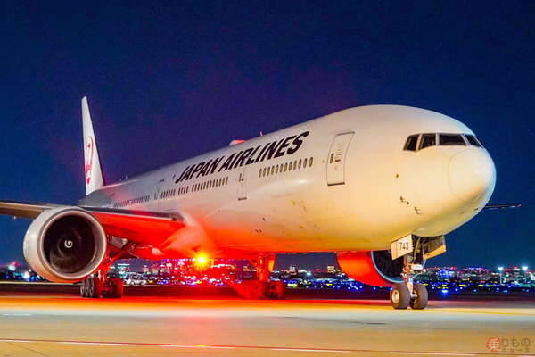 JALの長距離国際線の主力機、ボーイング777-300ER(2021年、乗りものニュース編集部撮影)。