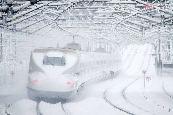 大人1人&子ども1人~乗車可雪の中を走る東海道新幹線のN700系(画像:PIXTA)。