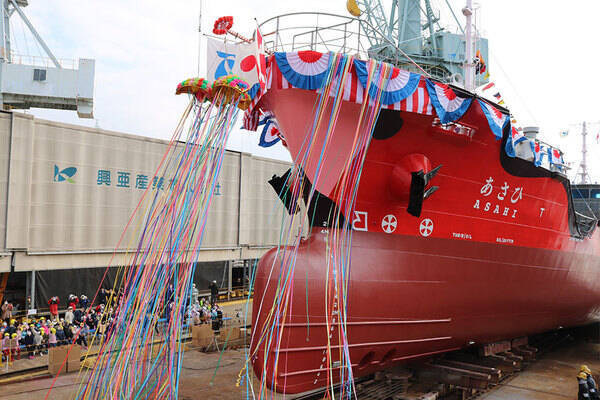 次世代内航EVタンカー「あさひ」(2022年3月竣工、4月就航)「あさひ」進水式の様子(画像:旭タンカー)。