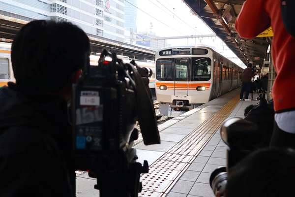 報道陣が待つ名古屋駅に到着した新型315系電車(2022年2月1日、恵 知仁撮影)。