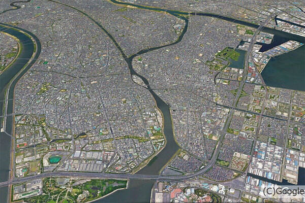 堀江橋(仮称)の架橋予定地。左が東京都、右が千葉県。導入空間は確保されている(Google Earthの画像を加工)。