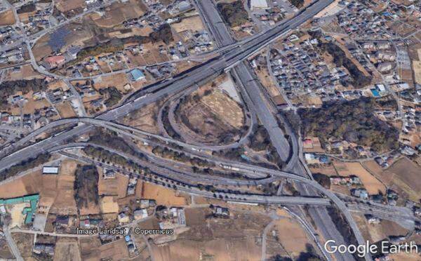 都心を避けて各方面の高速道路をむすぶ圏央道と関越道が交わる鶴ヶ島JCT(画像:Google Earth)。