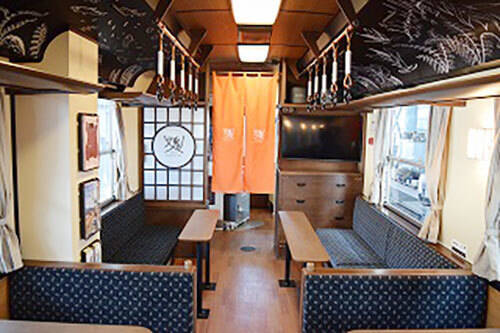 2両編成のディーゼルカーを改造した「お座敷列車マタギ号」をさらに改造したものです。コンセプトは「走るマタギの古民家」。沿線地域のマタギ文化に関心を高めてもらえる外装とし、畳敷きの座敷席は、背もたれ式のボックスシートへ変更するなどしたそうです。