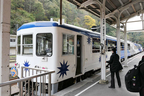 備後落合駅に到着した奥出雲おろち号。区間によってはチケットが取れないほどの取れないほどの人気を博す(宮武和多哉撮影)。