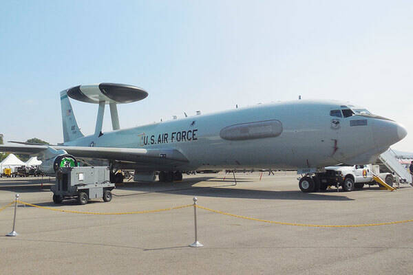 アメリカ空軍のE-3早期警戒管制機(竹内 修撮影)。