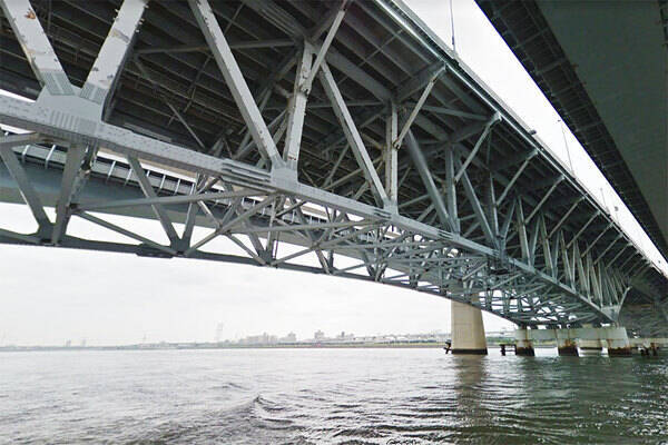 今回の荒川湾岸橋は湾岸線の新木場~葛西JCT間にあり、長さ840mで荒川の河口をまたいでいます。首都高では鶴見つばさ橋、レインボーブリッジ、横浜ベイブリッジに次ぐ4番目の長さ。およそ1700もの部材を斜めに組み合わせて構成したトラス形式のシンボリックな橋です。もっとも、完成後にJR京葉線の橋と国道357号の橋が並行して架かったため、現在は外からその姿は見えにくくなっています。