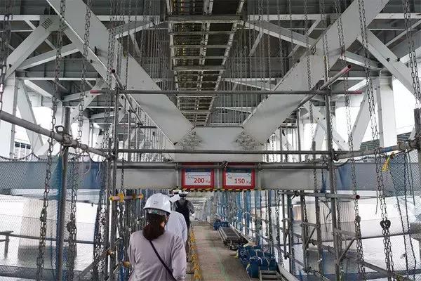 荒川湾岸橋のトラス内部。補修用の吊り足場を歩く(中島洋平撮影)。