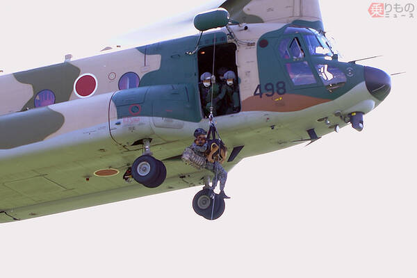 訓練では、県警機動隊所属のレスキュー隊員が県警のヘリコプターBK-117C-1「むさし」のホイストにより現場に降り立ち状況を確認、警備犬の投入が必要と判断します。これにより、今度は県警の別のヘリコプターA109Eによって警備犬が空輸され、ホイスト降下で現場へ投入されました。そして、現場の状況から自衛隊に応援要請が出され、今度は航空自衛隊の警備犬が入間基地のCH-47J輸送ヘリコプターのホイスト降下で現場へと降り、警察と自衛隊の合同で捜索を実施。