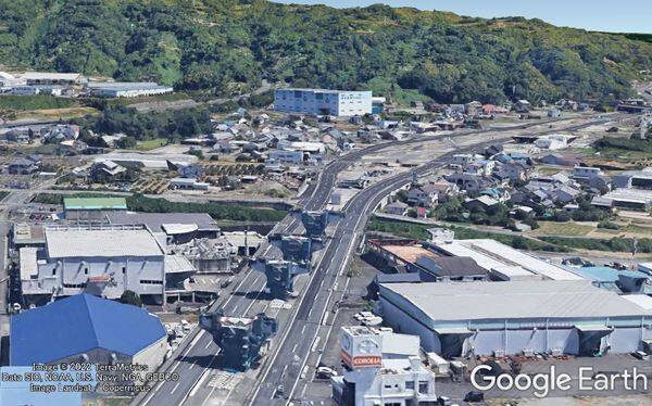 橋脚と橋げた工事が着々と進む橋脚が姿を現している清水IC周辺の国道1号(画像:Google Earth)。