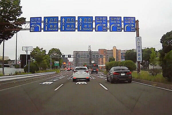 仙台バイパスの六丁目交差点。南行きは交差点手前で7車線になる(ドラレコ画像)。