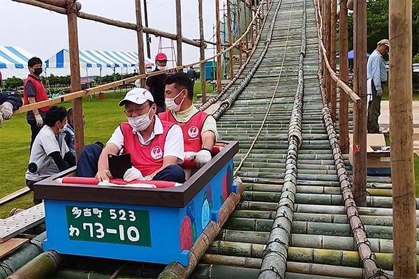 なお、「竹コースター」の制作には、JAL(日本航空)からも総勢15人のボランティアスタッフも携わったとのこと。「前日の組み立てからお手伝いさせていただき、地元の方と協力して一日がかりで制作しました。今回『竹コースター』は復活すると聞いて、普段からお世話になっている多古町に何かお手伝いできることはないかと協力を申し出ました」、同社はこのようにコメントしています。