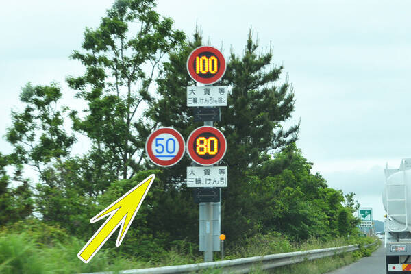 三陸道を八戸から南へ走り、宮城県内の桃生豊里IC(石巻市)を過ぎると、暫定2車線の道路が4車線に広がります。最高速度も80km/hから100km/hに引き上がり、無料区間ながら、東北道などとほぼ同等のスペックに。この区間ではデジタル式の可変速度標識が上下に配置され、上の標識は「100」、下の標識は大型車の最高速度である「80」の数字を表示しています。