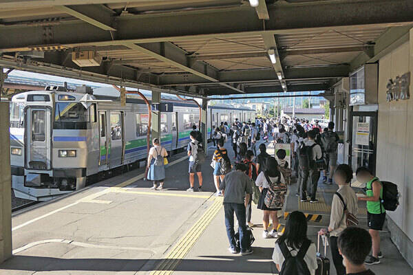 “山線”沿線の1市8町が鉄道廃止・バス転換に向けて抱える悩みはさまざま。例えば前述の小樽~余市間は輸送密度(1kmあたりの1日平均旅客輸送人員)が2144(2018年度)とJR北海道管内のなかでも高く、余市駅では朝7時台の小樽・札幌方面への列車に200人ほどの利用があり、乗降で発車に手間取るほど。余市町は国勢調査の分類で「札幌都市圏」(通勤・通学が10%以上)に入るほどに小樽・札幌への移動需要が多く、現状でも60往復程度運行されている既存の路線バス(北海道中央バス余市小樽線など)で、朝晩の鉄道に集中する需要をどれだけこなせるかが課題となります。