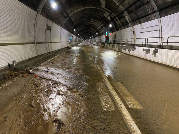 北陸道 敦賀トンネルに流入した土砂(画像:NEXCO中日本)。