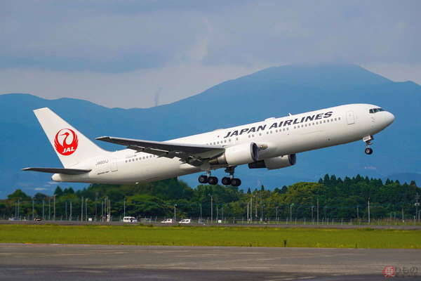 鹿児島空港を離陸するJALのボーイング767(乗りものニュース編集部撮影)。