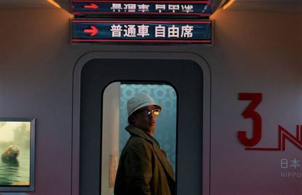 荒唐無稽の350km/hミステリーアクション映画が日本公開依頼を受けて超高速列車「ゆかり号」に乗ったレディバグ(ブラッド・ピット)だが…(映画『ブレット・トレイン』より)。