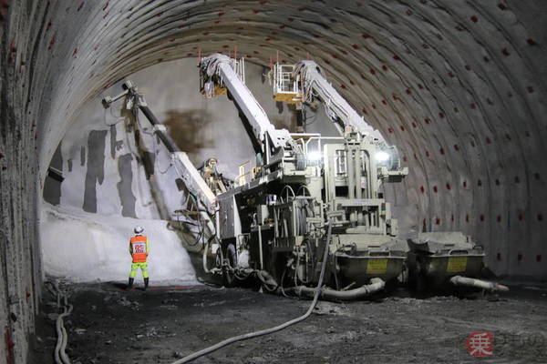 南アルプス本坑の掘削現場(乗りものニュース編集部撮影)。
