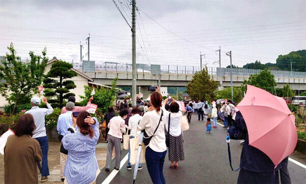 嬉野温泉駅周辺での新幹線歓迎セレモニーの様子(画像:JRTT鉄道・運輸機構)。